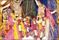 'सखियन के उर ऐसी आई, ब्याहु विनोद रचै सुखदाई। अष्टयाम लीला के दौरान रविवार को प्रिया-प्रियतम के ब्याहुला की मनमोहन प्रस्तुति ने मौजूद श्रद्धालुओं को मंत्रमुग्ध कर दिया। नंदिनी गोलोक धाम लीला में सखियों की इच्छा पर श्रीकृष्ण-राधा के विवाह का प्रस्ताव रखा गया। इसके लिए सखियों ने फूलों की मौहर सजा, तरह-तरह के आभूषणों से यगु